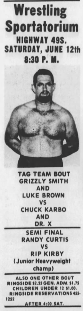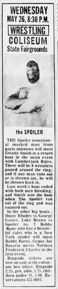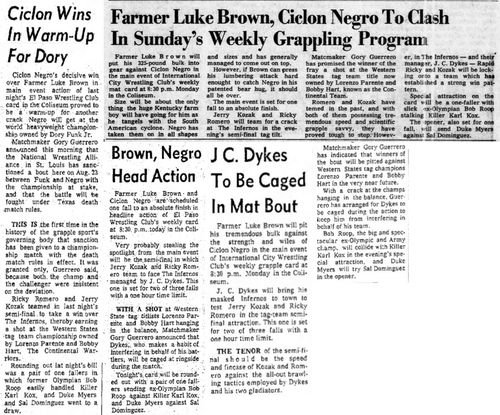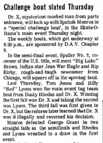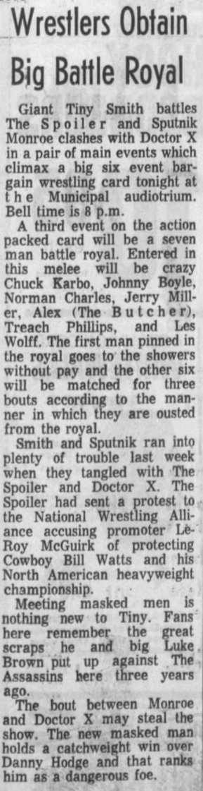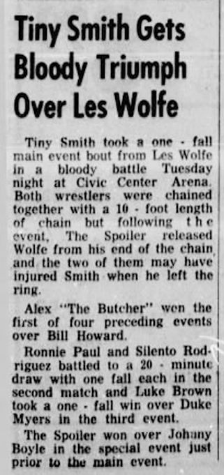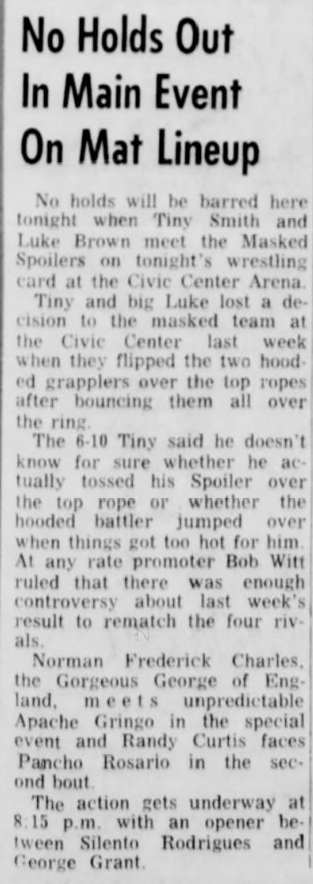 “Meeting masked men is nothing new to Tiny. Fans here remember the great scraps he and big Luke Brown put up against he Assassins here three years ago.”