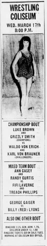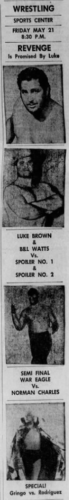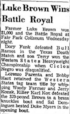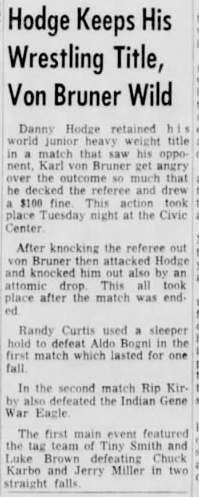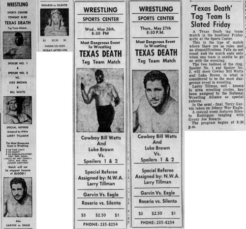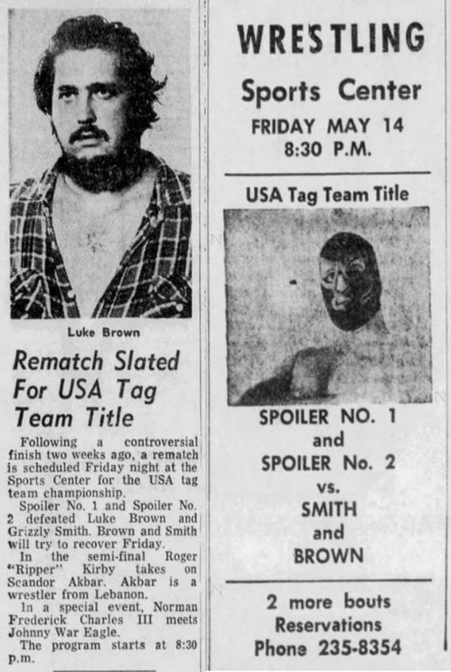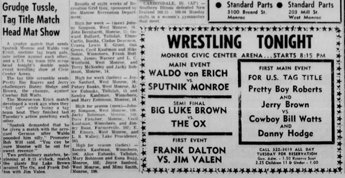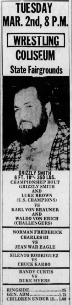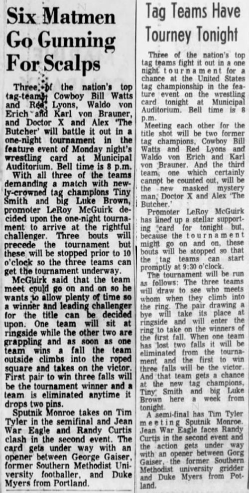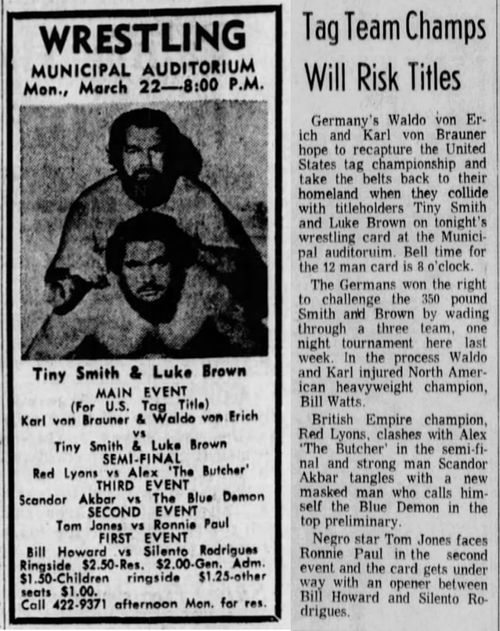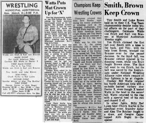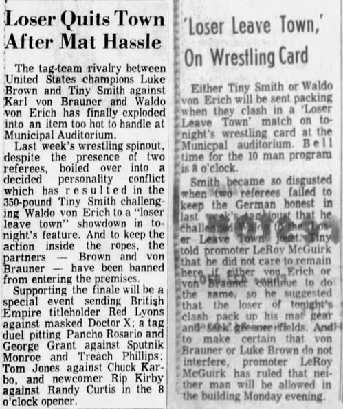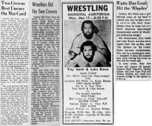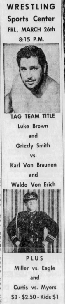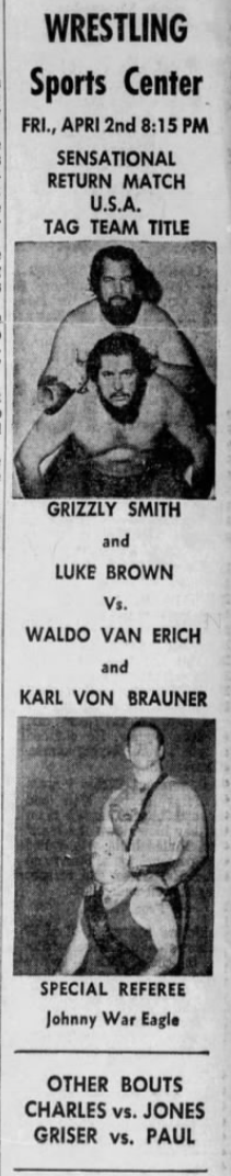 “They also had a long feud with Waldo Von Erich and Kurt Von Brauner over the U.S. tag titles. In a strange angle, Von Erich and Von Brauner were scheduled to defend against Cowboy Bill Watts and Billy “Red” Lyons in Oklahoma City in a 3 out of 5 fall match. Watts won the first fall. The Germans won the second fall and in the process injured Lyons where he was unable to continue. The ref allowed Watts to pick another partner to finish the match and Watts picked Grizzly Smith. The Germans won the third fall and Watts was too injured to continue. Now Smith was allowed to pick a new partner and he chose Luke Brown. Smith and Brown won the fourth and fifth falls to win the belts. It was announced on television the next week that because of the substitutions, the belts were being returned to the Germans. This led to title matches around the horn for Smith and Brown where they won the belts.”