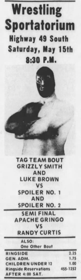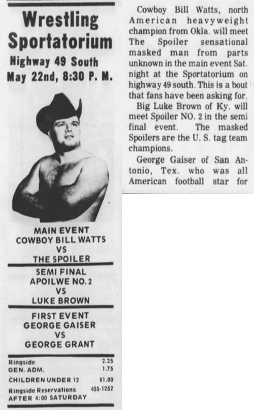 Buddy Wolfe – the Spoiler (Don Jardine) vs. Wahoo McDaniel – El Santo
