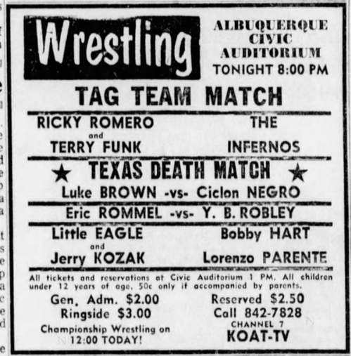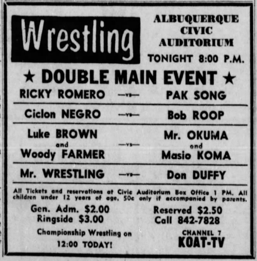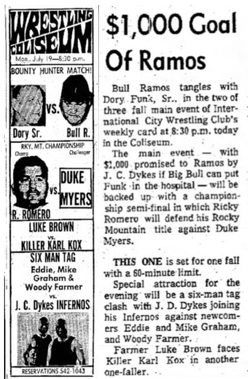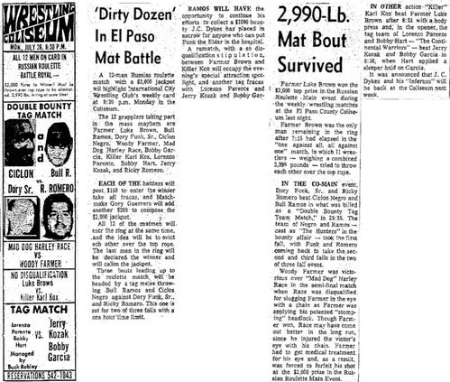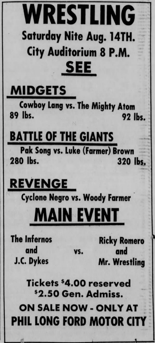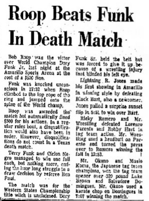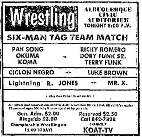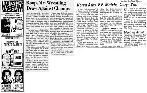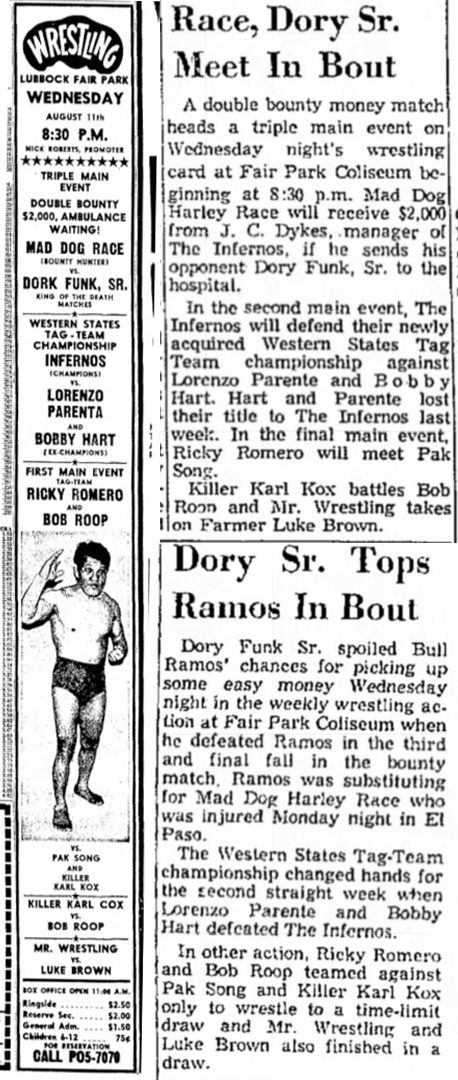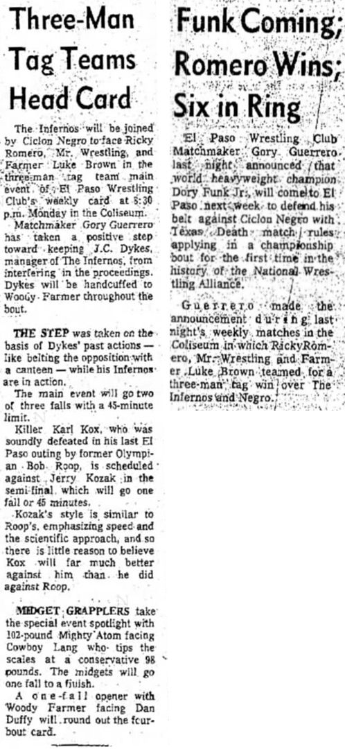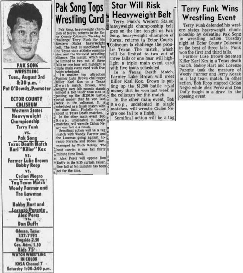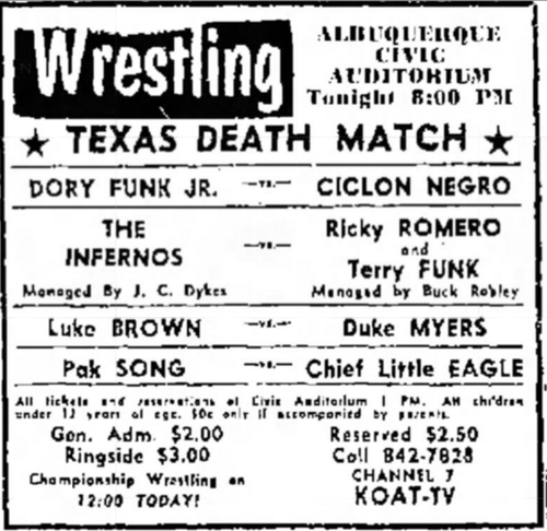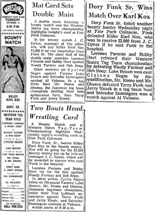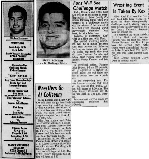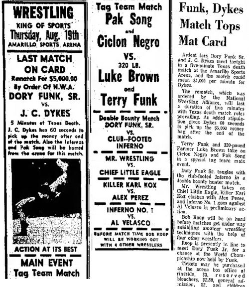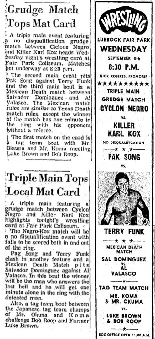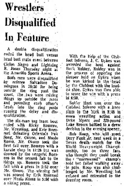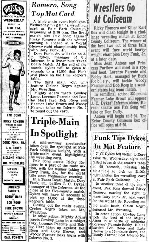 Fritz Von Erich – Danny Plechas def Johnny Valentine – Spoiler (sub for injured Thunderbolt Patterson), special referee Duke Keomuka