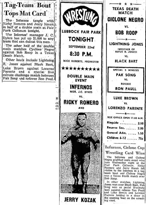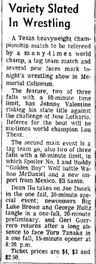 Johnny Valentine (Texas champ) vs. Jose Lothario – Special referee: Lou Thesz