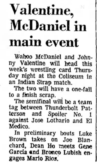 Wahoo McDaniel – Jose Lothario drew Johnny Valentine – Thunderbolt Patterson