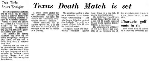 Johnny Valentine def Wahoo McDaniel, lights out Indian strap match