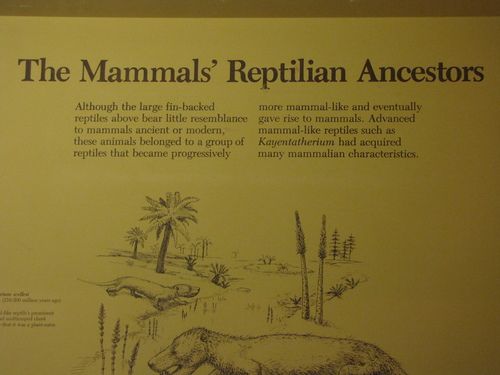 The last question, turns out, is one that Smithsonian is happy to answer. In a display conveniently located next to the overpriced museum cafeteria, it is explained (I paraphrase and quote in part) that the more “mammal-like” of the reptiles evolved into the mammals of today.