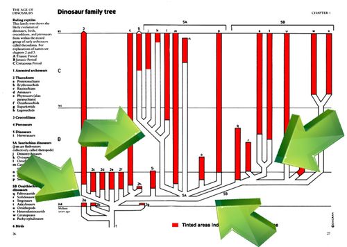 You may be looking at this chart and thinking, “There’s the evidence. Sure enough it shows evolution! If you start at the bottom of the chart and follow it up over the millions of years this shows that given enough time and the right circumstances, small reptiles evolved into all of the dinosaurs we find in the fossil record. What’s the problem?”