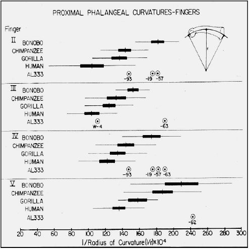 So, what’s the truth? Below I’m showing you a chart comparing the curvature of the fingers between, Bonobo (type of chimpanzee), Chimpanzee, Gorilla, Human and AL333 (australopithecine specimen). The further to the right the dark line is, the more curved the finger. Please notice that the circle with the dot inside is Lucy’s “cousin.” It shows that their fingers were just as curved, if not more curved than a chimpanzee. Hmmm!