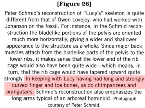 Did you catch that last part? “In keeping with Lucy having had long and strongly curved finger and toe bones, as do chimpanzees and orangutans”!