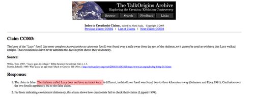 Well, let’s take a look at this claim and we’ll do it by looking at a website that is as anti-creationist as you will ever find. Below is a graphic of the page talking about various claims concerning ‘Lucy’ that “creationists” make.
