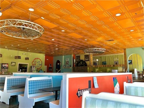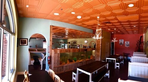 When I say it was absolutely beautiful, I mean that as an understatement. We hired a professional designer who chose all of the vibrant colors and fabrics. Local artists submitted pieces that were hung (for sale) all over the restaurant. We even had a 750-gallon fish tank as a centerpiece divider between the upper and lower levels you could see right through. It included a miniature replica of a famous town landmark featuring an actual running water wheel!